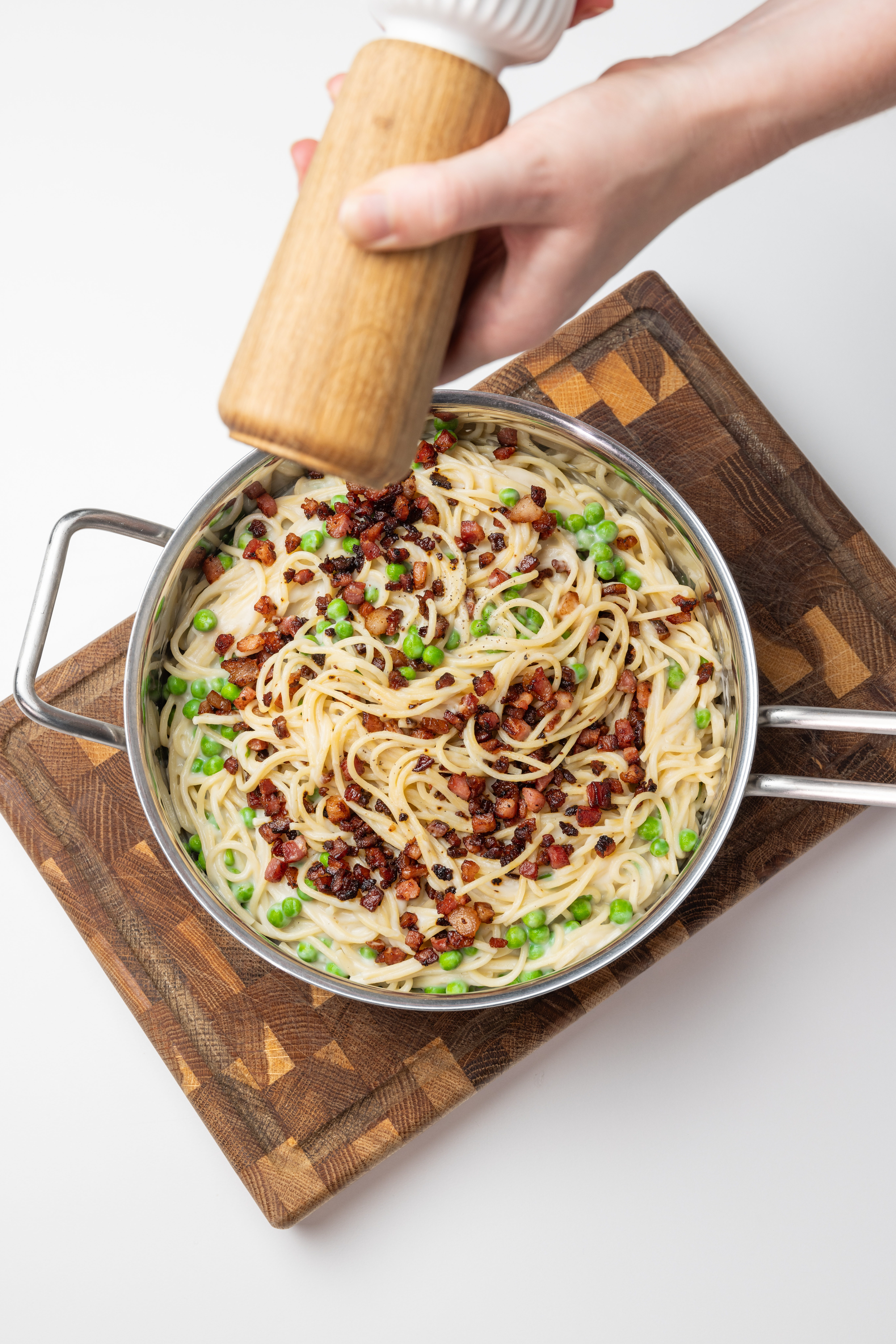 Vend spaghetti, bacon og ærter i blomkålssovsen, og server. Top evt. med revet parmesanost.